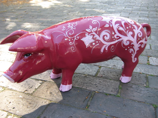 Das Blütenranken Schwein, ist in der Hauptfarbe karminrot, mit rosafarbenen Ranken und Blüten bemalt. Außerdem wurde es mit silberfarbenen Perlenpen verziert. Das Blütenranken Schwein ist 60cm lang und 30cm hoch, wetterfest und frostfest.
