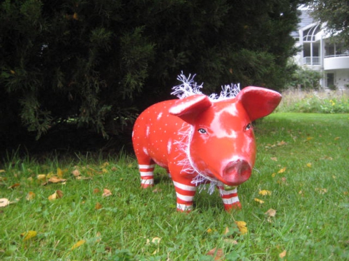 Das weihnachtliche Gartenschwein ist 60cm lang und 30cm hoch, wetterfest und frostfest und von der Künstlerin signiert.