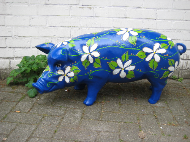 Blaues Gartenschwein mit Margeriten, die wie in einem Netzwerk durch grüne Ranken verbunden sind.Die Blüten und Blätter sind golden akzentuiert. Das Gartenschwein ist 100cm lang und 50cm hoch, wetterfest und frostfest.