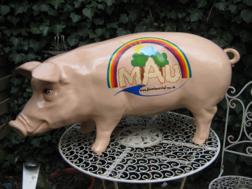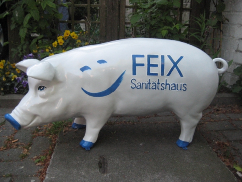 Schwein mit Ihrer persönlichen Werbung und Logo. Sympatische und niveauvolle Werbung, die Aufmerksamkeit beim Betrachter auslöst. Logos reichen Sie gerne als JPG oder EPS bei uns ein. Gerne arbeiten wir auch nach RAL-Farbtönen. Das Schwein mit Werbung ist 100cm lang und 50cm hoch, wetterfest und frostfest.