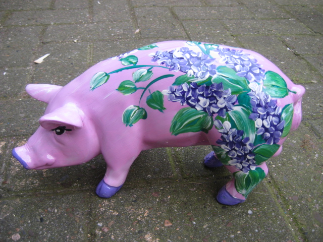 Rosa Glücks-Schwein mit blauen Fliederblüten. Schnauze und Hufe sind fliederfarbend abgesetzt. Es ist 30cm lang und 17cm hoch, wetterfest und frostfest.