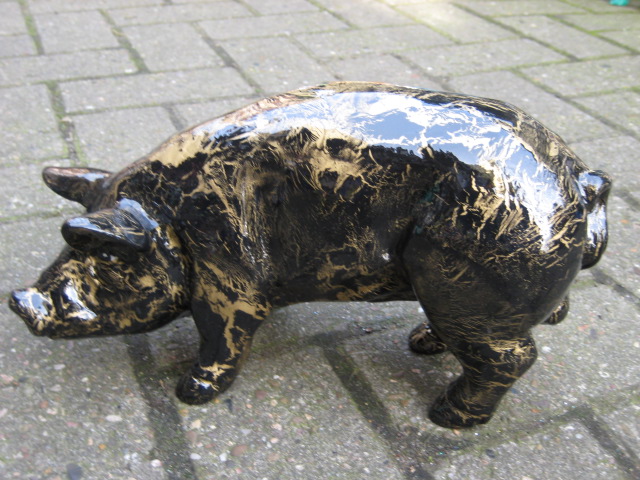 Das schwarz- goldene Glücksschwein in der Hauptfarbe schwarz ist mit einem goldenen Muster bemalt. Das schwarz- goldene Glücksschwein ist 30cm lang und 17cm hoch, wettserfest und frostfest.