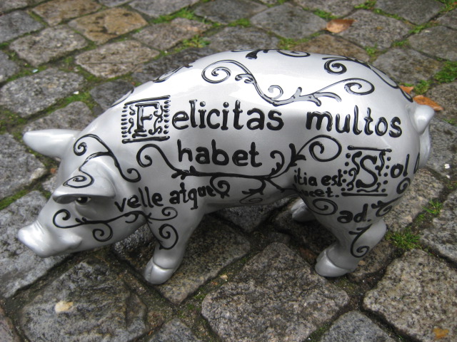Das Schwein "Silber mit lateinischen Spruch" in der Hauptfarbe silbern bemalt. Die Schrift ist in schwarz mit verschiedenen Ornamenten verziert. Das Schwein "Silber mit lateinischen Spruch" ist 30cm lang und 17cm hoch, wettserfest und frostfest.