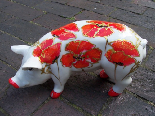 Das Schwein "Stiefmütterchen" in der Hauptfarbe weiß, mit wunderschönen blauen Stiefmütterchen bemalt. Außerdem wurde das Schwein, mit weißen Liner verziert und die Schnautze sowie die Füße sind blau abgesetzt. Die bemalung kann auch variiert werden. Das Schwein "Stiefmütterchen" ist 30cm lang und 17cm hoch, wettserfest und frostfest.