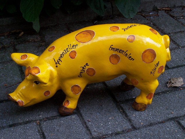 Glücksschwein im Käse-Design: alles Käse!- ganz in gelb mit vielen Löchern und Käsesorten beschriftet. Das Glücksschwein ist 40cm lang und 20cm hoch, wetterfest und frostfest.