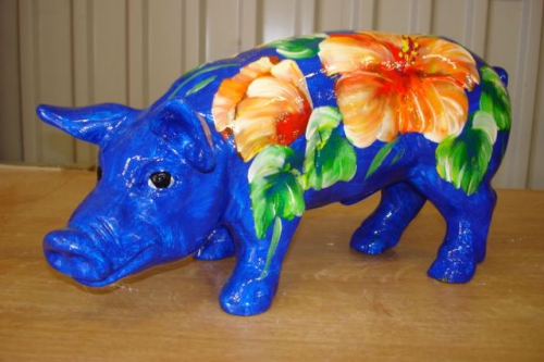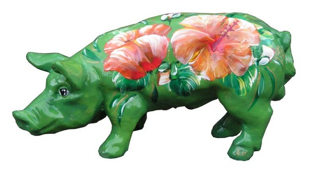 Das Hibiskus Schwein, ist in der Hauptfarbe grün-gelb gewischt, mit einem rot, orange farbenen Hibiskus und kräftig grünen Blättern bemalt. Kann nach Wunsch variiert werden. Das Hibiskus Schwein ist 40cm lang und 20cm hoch, wetterfest und frostfest.