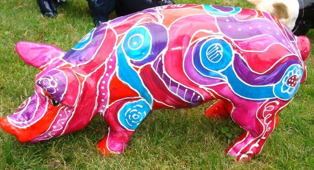 Das Hippie-Schwein, ist in den Farben rotviolett, zinnoberrot, krapprot, rosa und hellblau bemalt. Außerdem wurde es mit weißen Liner verziert. Das Hippie-Schwein ist 40cm lang und 20cm hoch, wetterfest und frostfest.