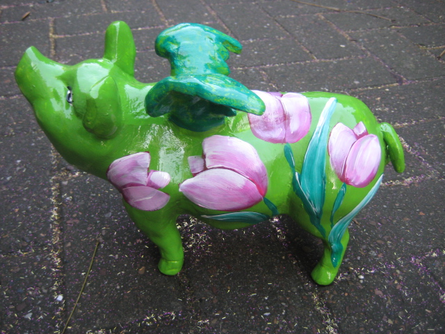 Grünes Flügelschwein mit rosa Tulpen. Die Flügel sind in einem dunklerem Grünton abgesetzt. Das Flügelschwein ist 32cm lang und 20cm hoch, wetterfest und frostfest.