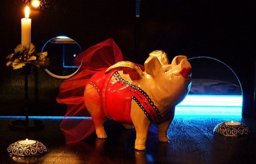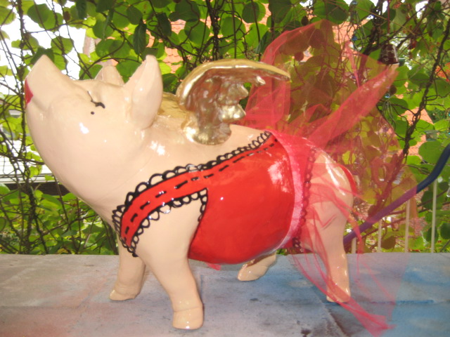 Elegantes Hummel-Schwein im roten Kleid mit handgenähtem roten Tutu. Die Flügel sind golden abgesetzt. Die Lady in red ist 32cm lang und 20cm hoch, wetterfest und frostfest.