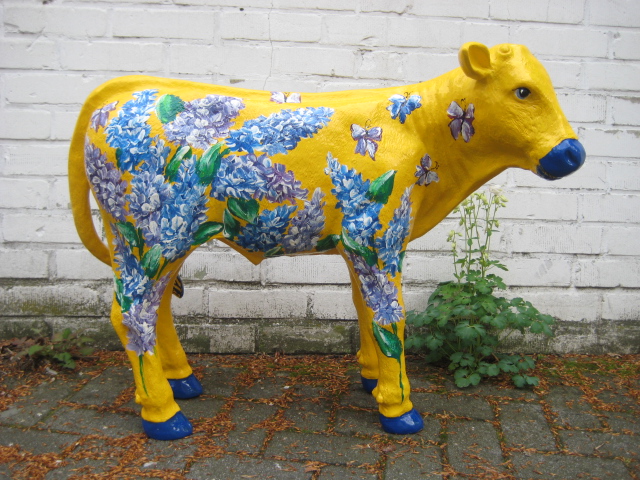 Gelbes Kalb aus GFK (glasfaserverstärkter Kunststoff) mit blauem Flieder und Schmetterlingen.