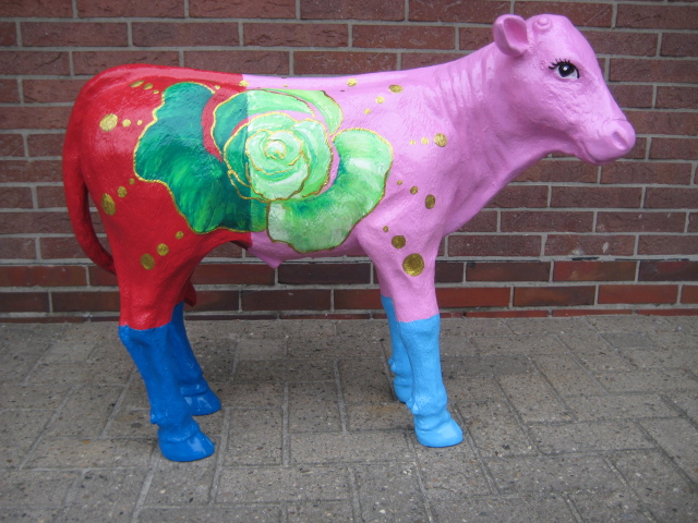 Kleines mehrfarbiges Kalb aus GFK (glasfaserverstärkter Kunststoff) mit grüner Rose.