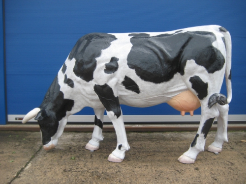 Grasende, lebensgroße Kuh in braun-weiß oder schwarz-weiß gefleckt. Sehr schön ist die Struktur ihrer braunen Flecken, die durch eine spezielle Maltechnik hervorgehoben sind. Diese lebensgroße Kuh besteht aus Glasfaser-Kunststoff-Laminat (GFK) und ist wetterfest und frostfest.