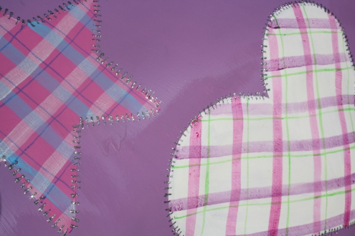 Lila lebensgroße Kuh mit Sternen und Herzen. Die Herzen und Sterne sehen schon fast wie Patchwork-Arbeiten aus; umrändert sind die karierten Muster mit einer silber Glitterkontur, die hervorragend im Sonennlicht funkelt. Zwischen den Mustern blitzen viele Strass-Steine auf. Die Schnauze, Hufe, Hörner und Schwanz sind mit dezentem pinkfarbenem Glitter akzentuiert.