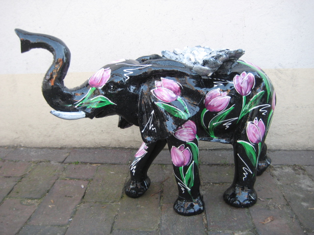 Der schwarze, geflügelte Elefant ist mit pinkfarbenen Tulpen übersäht. Richtig schön sieht er aus, wenn er in der Sonne steht; er ist mit Glitter überzogen.